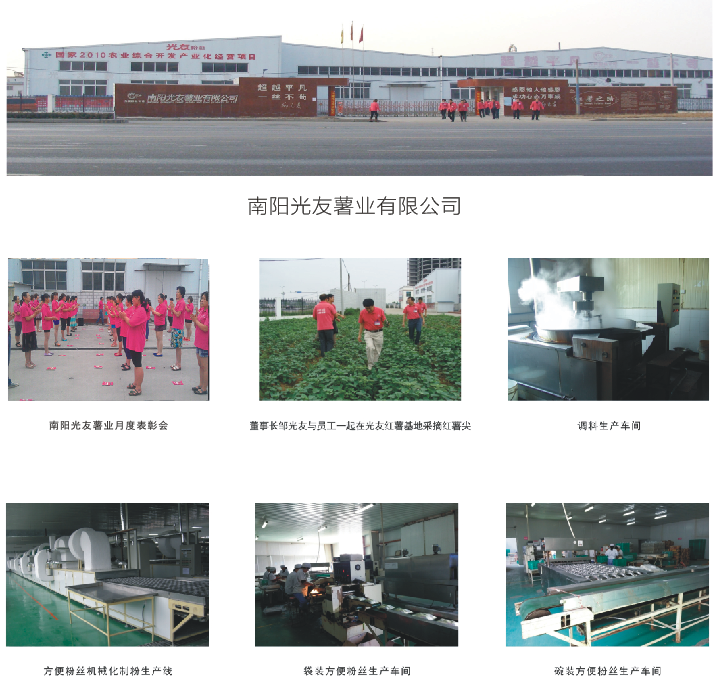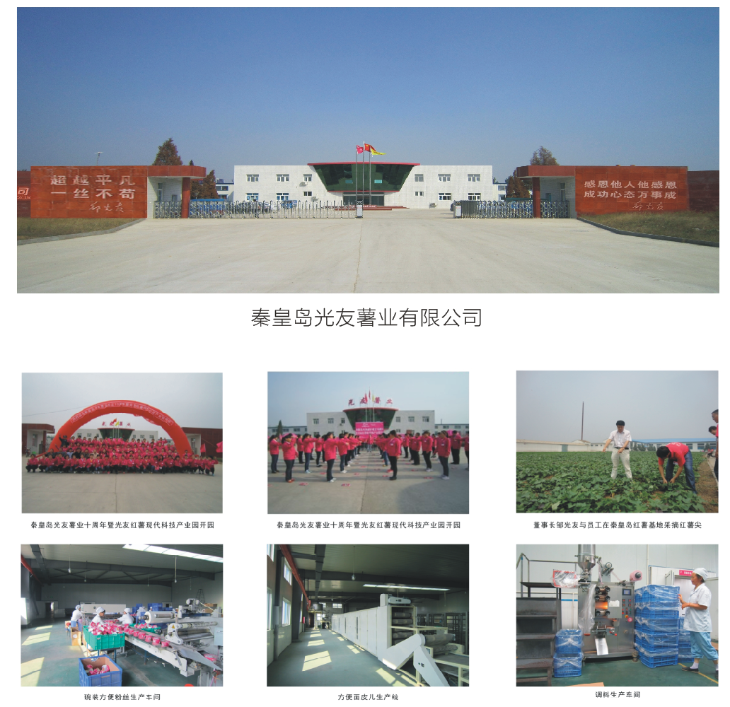 四川光友薯業(yè)有限公司是一家以紅薯深加工為主的高新技術(shù)型、科技產(chǎn)業(yè)型民營企業(yè),下轄秦皇島光友薯業(yè)有限公司、南陽光友薯業(yè)有限公司、光友紅薯博物園等。 光友薯業(yè)創(chuàng)建于1992年10月18日,位于中國四川綿陽國家高新技術(shù)產(chǎn)業(yè)開發(fā)區(qū)火炬西街南段8號、主要開發(fā)生產(chǎn)以紅薯、紫薯為原料的方便粉絲、紫薯粉絲、全薯粉絲、粉絲湯、煮食粉絲、紅薯粉皮、薯粥、薯糊、紫薯奶茶、紫薯飲品、紫薯茶、紫薯酒、紫薯保健食品等紅薯、紫薯健康美食,以及方便米線、方便面皮等方便食品。