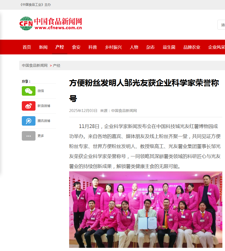 轉(zhuǎn)載中國食品新聞網(wǎng)-方便粉絲發(fā)明人鄒光友獲《企業(yè)科學家》榮譽稱號